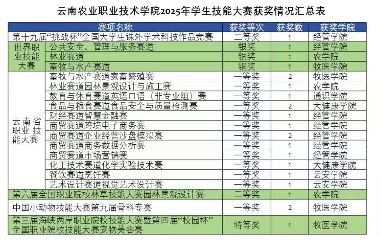 时至金秋,2025年世界职业院校技能大赛和云南省职业院校技能大赛等比赛相继落幕,我校参赛团队凭借扎实的专业知识、精湛的操作技艺以及默契的团队协作,一路披荆斩棘,斩获多项大奖,充分展示了云农院学子“以技立身、以技赋能”的青春风采,为学校“十四五”的收官工作交上了一份完美答卷。
