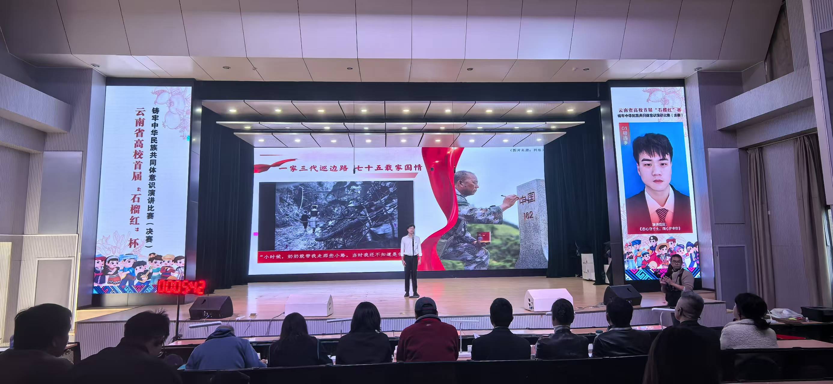我校高度重视此次比赛,积极组织校内选拔,遴选优秀选手,组建指导团队开展系统培训,有关部门、各二级学院、校团委积极推荐师生参与。最终刘琦琳、黄欣然两位老师成功晋级全省决赛。比赛现场,黄欣然以《稻香鱼跃同心路,石榴花开映山红》为题,深情讲述了我校毕业生、全国“人民满意的公务员”李万彬为了澜沧江的水清鱼跃 ,扎根拉祜山乡30余年,手把手向乡亲传授生产技能、助力乡村振兴的民族团结故事,质朴的叙事中饱含温情与力量;刘琦琳则以《赤心守寸土,同心护中华》为题,生动刻画了云南文山熊光泽一家三代守边人坚守边疆、守护家园的赤诚形象,展现了各民族共护国土、同心筑梦的深厚情怀。两位教师的演讲情感真挚、事例鲜活、感染力强,赢得评委与现场观众的一致认可。