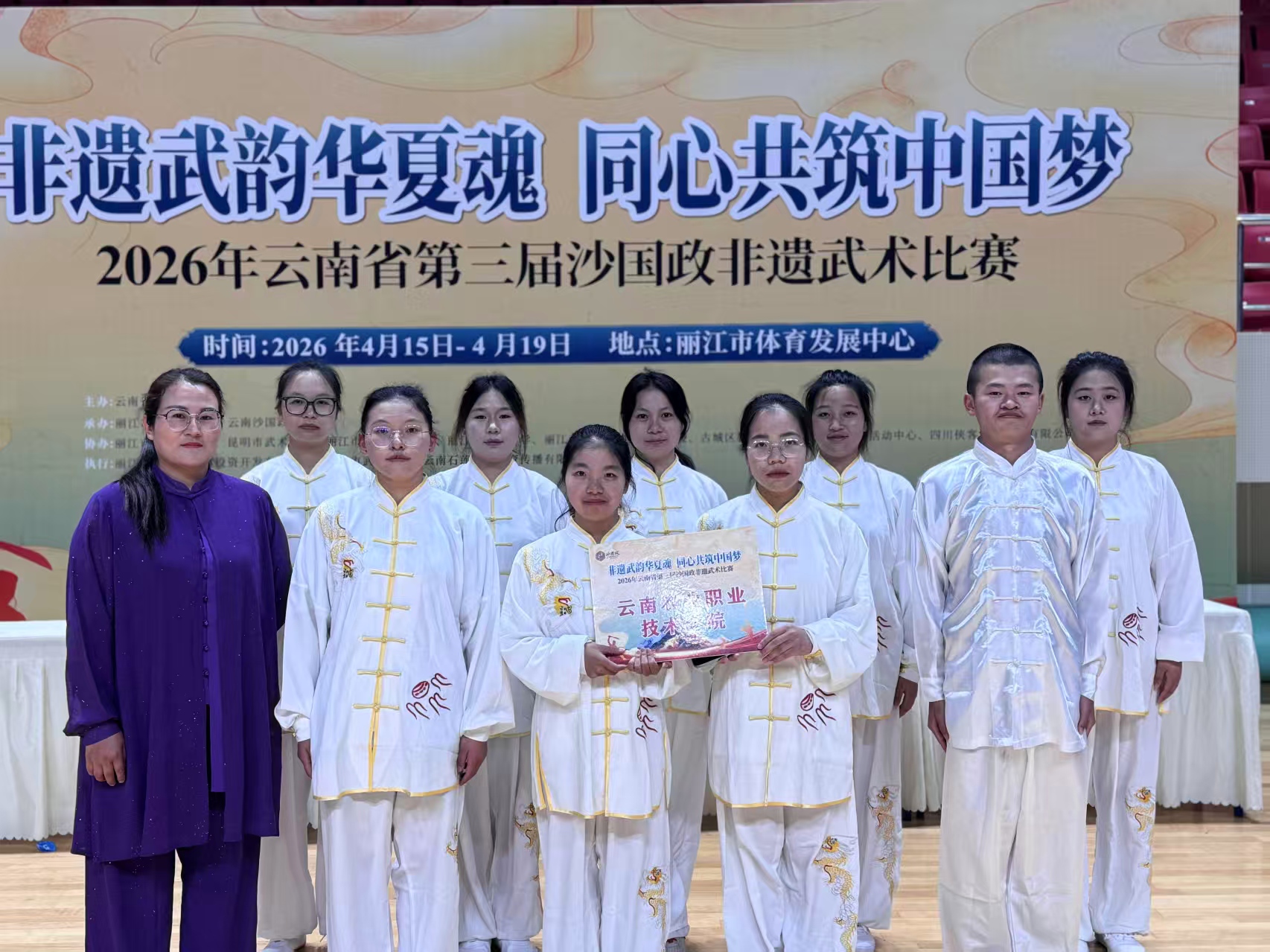 4月15日至19日,云南省第三届沙国政非遗武术比赛在丽江市古城区体育活动中心综合馆圆满落幕。我校师生代表队怀揣传承非遗的初心,以武会友、奋勇拼搏,在赛事中斩获多项荣誉,用赛场风采诠释中华传统武术的文化魅力,为沙国政非遗武术的传承与发展注入了青春力量与校园活力。