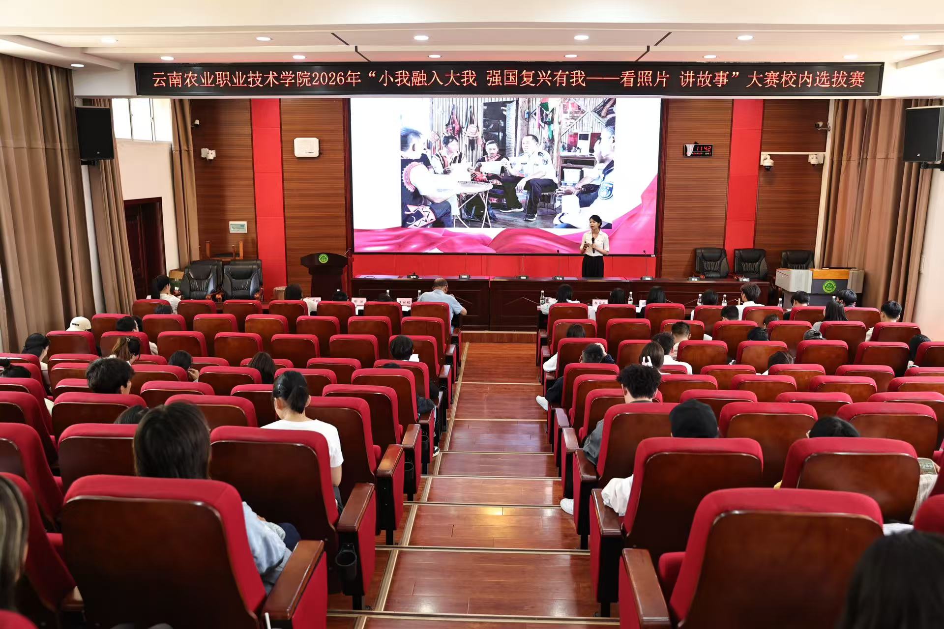 比赛现场氛围热烈、秩序井然。参赛选手紧扣“小我融入大我 强国复兴有我” 主题,结合一张张承载记忆的照片,生动讲述身边爱党爱国、青春奋斗、教育强国、乡村振兴、生态文明、致敬楷模、创业创新等真实感人的故事。选手们的讲述情感真挚、内容鲜活、形式新颖,既饱含时代精神,又彰显云南特色,充分展现了农职师生昂扬向上、笃行奋进的精神风貌,赢得现场评委与观众的阵阵掌声和一致好评。