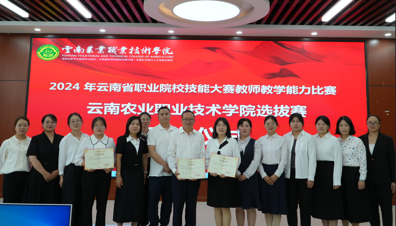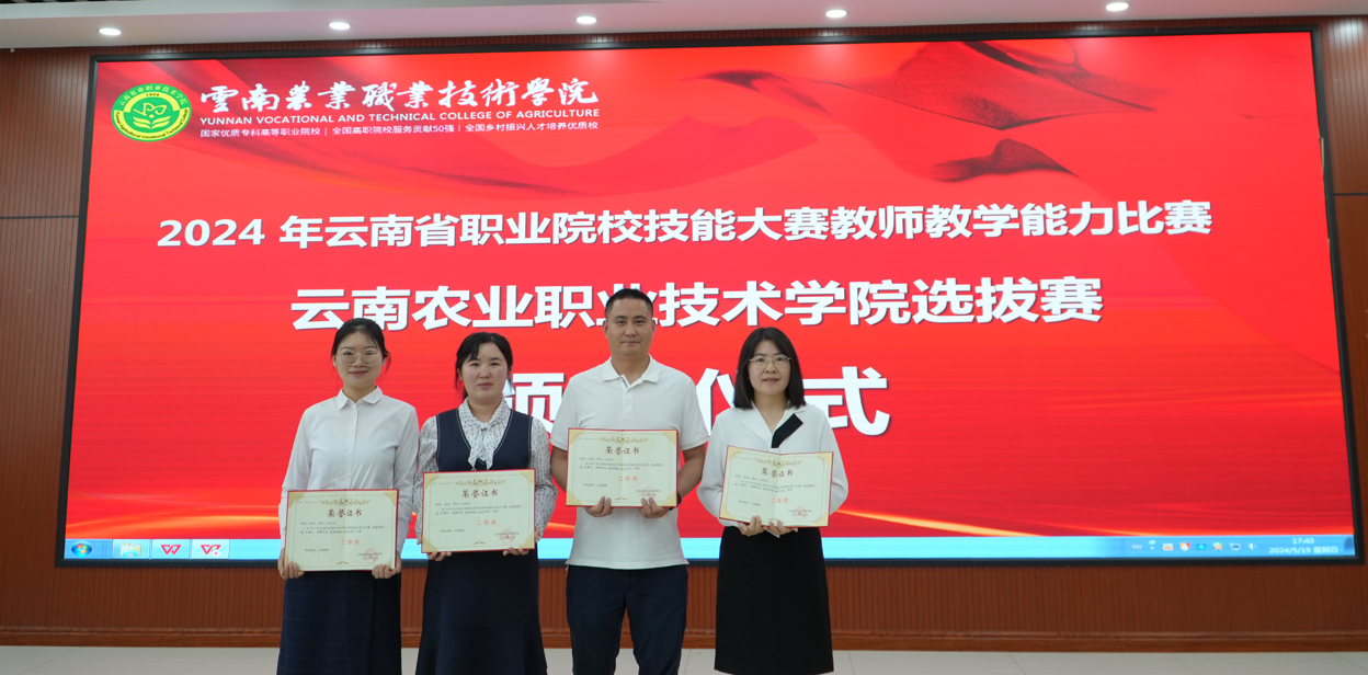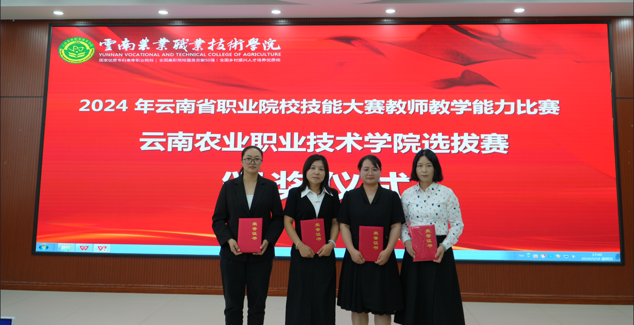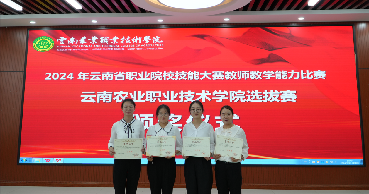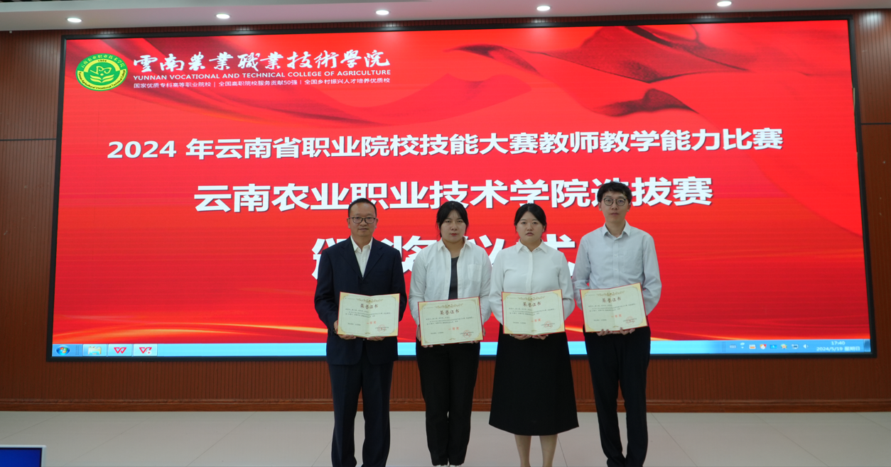 5月19日,2024年云南农业职业技术学院技能大赛教师教学能力比赛暨省赛选拔赛在学院茭菱校区落下帷幕。经过网络评审和现场角逐,食品药品与大健康学院参赛课程团队《酸碱滴定法应用》赵苑伶、唐小涵、张怀辉、李翔宇获一等奖;《杏林探秘 走近中药》杨燕、徐率、李玛、汪新月、《社区药学服务》张艳青、赵晓芹、解芬、马祖红和《助乡村振兴之果蔬发酵制品加工技术》杨子姗、施忠芬、杞斯卡娜、杨普秋等三个团队获二等奖。