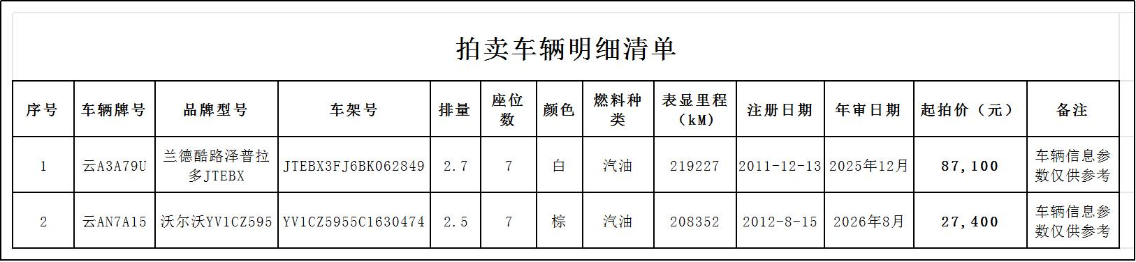 云南农业职业技术学院委托云南泰运拍卖有限公司对两辆行政事业单位公车进行公开拍卖,现将有关事宜公告如下: