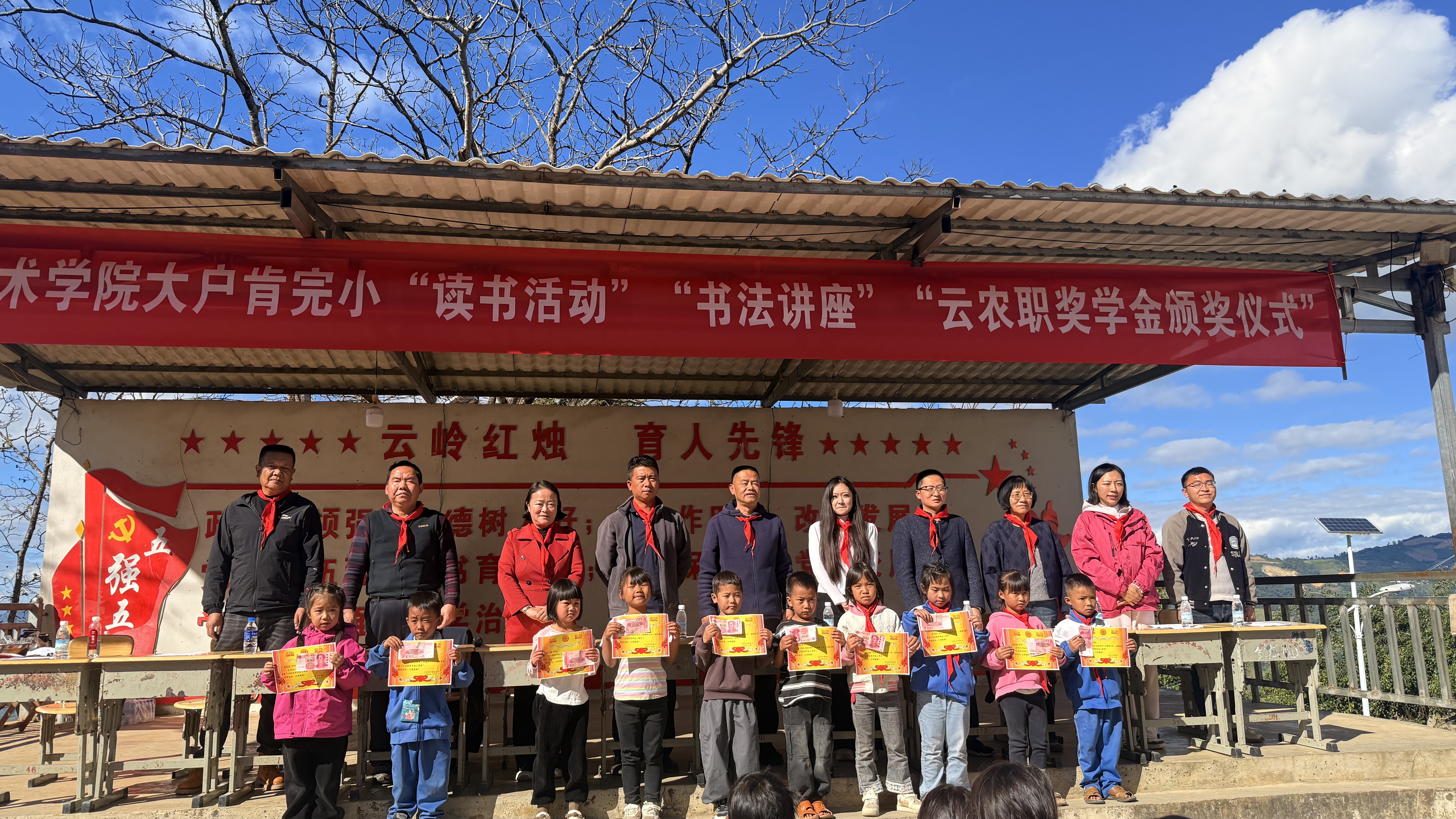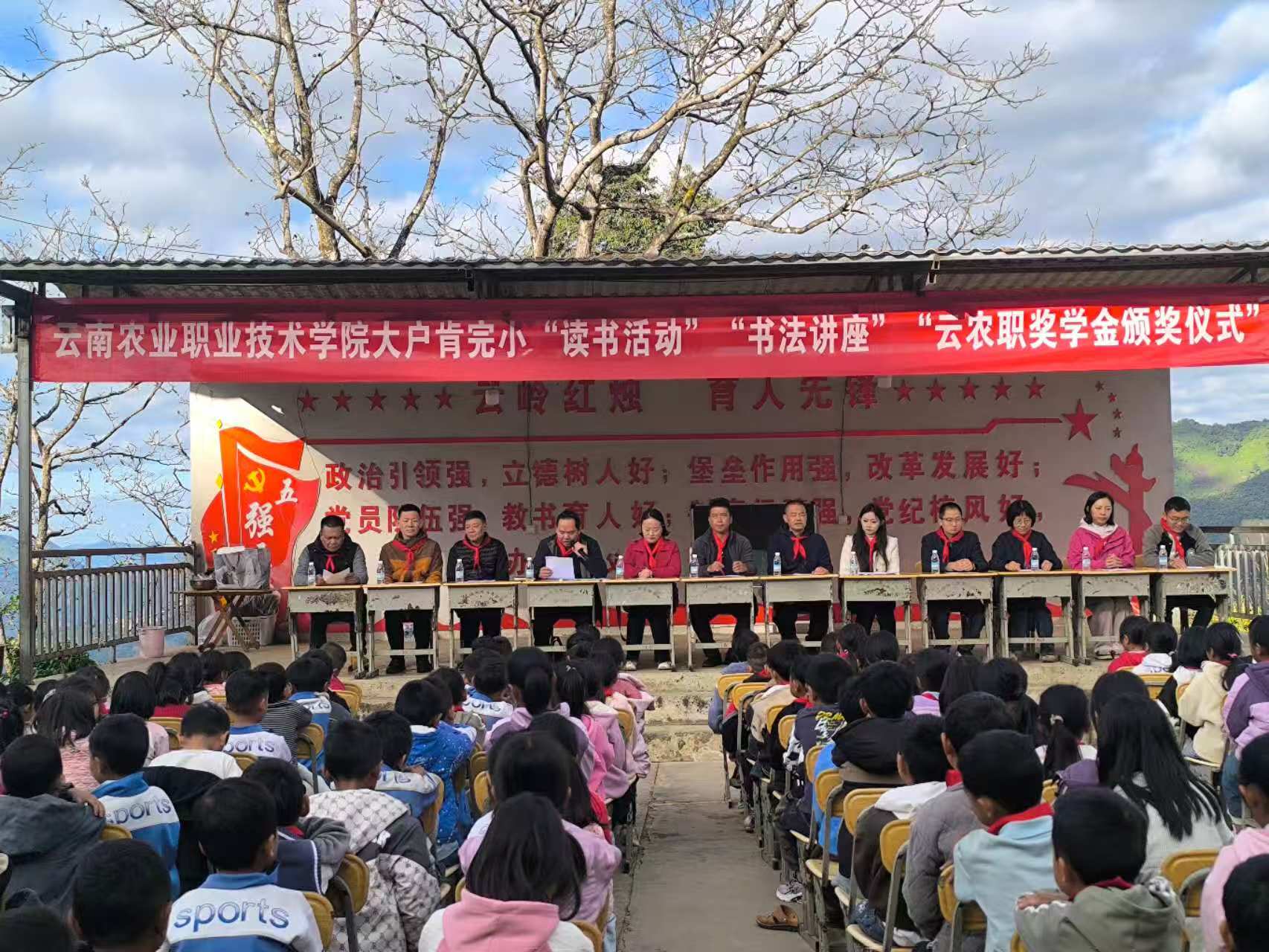 11月16 —18日,学校关心下一代工作委员会凌军副主任、宣传部杨筱莹部长、留学人员联谊会赵茜会长等一行13人前往学校挂钩帮扶点——耿马县大兴乡龚家寨村、大户肯村开展慰问、培训、交流、助力乡村振兴活动。在大户肯小学,开展了“新时代好少年”主题读书活动、书法讲座、书法比赛、秋冬季节流行性传染病宣讲、“云农职奖学金”颁奖仪式等活动,并向大户肯小学和全体学生发放慰问品;在龚家寨,举行了龚家寨小学“云农职奖学金”发放仪式,开展送健康义诊活动,进行助力乡村振兴种、养殖技术培训,并向龚家寨小学和那卡爬办学点发放慰问品。此次活动体现了学校对教育事业的关心支持以及对孩子们的关爱期望。