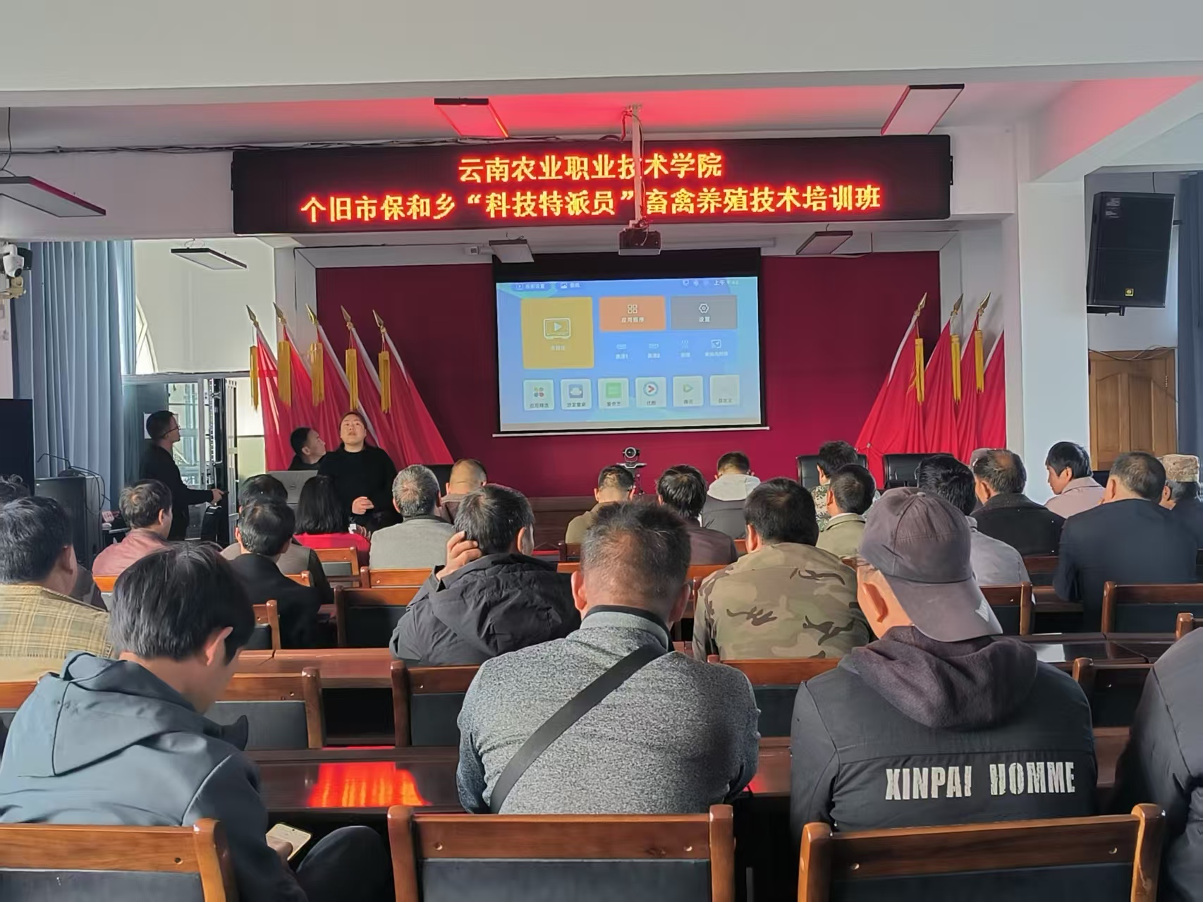 在个旧市农业农村局、保和乡政府、保和乡农业综合服务中心、保和乡木花果兴农养殖专业合作社等单位的大力协助下,科技特派员团队在保和乡政府三楼会议室举办了“云南农业职业技术学院·个旧市保和乡‘科技特派员’畜禽养殖技术培训班”。云南省草地动物科学研究院研究员赵刚,学校科技特派员、正高级畜牧师刘绍贵两位专家,分别围绕“肉牛高效养殖技术”“肉牛常见疾病”两个专题,结合多年科研实践与生产案例,为40余名养殖户和村民进行了系统、生动的讲解,现场交流热烈,培训效果显著。