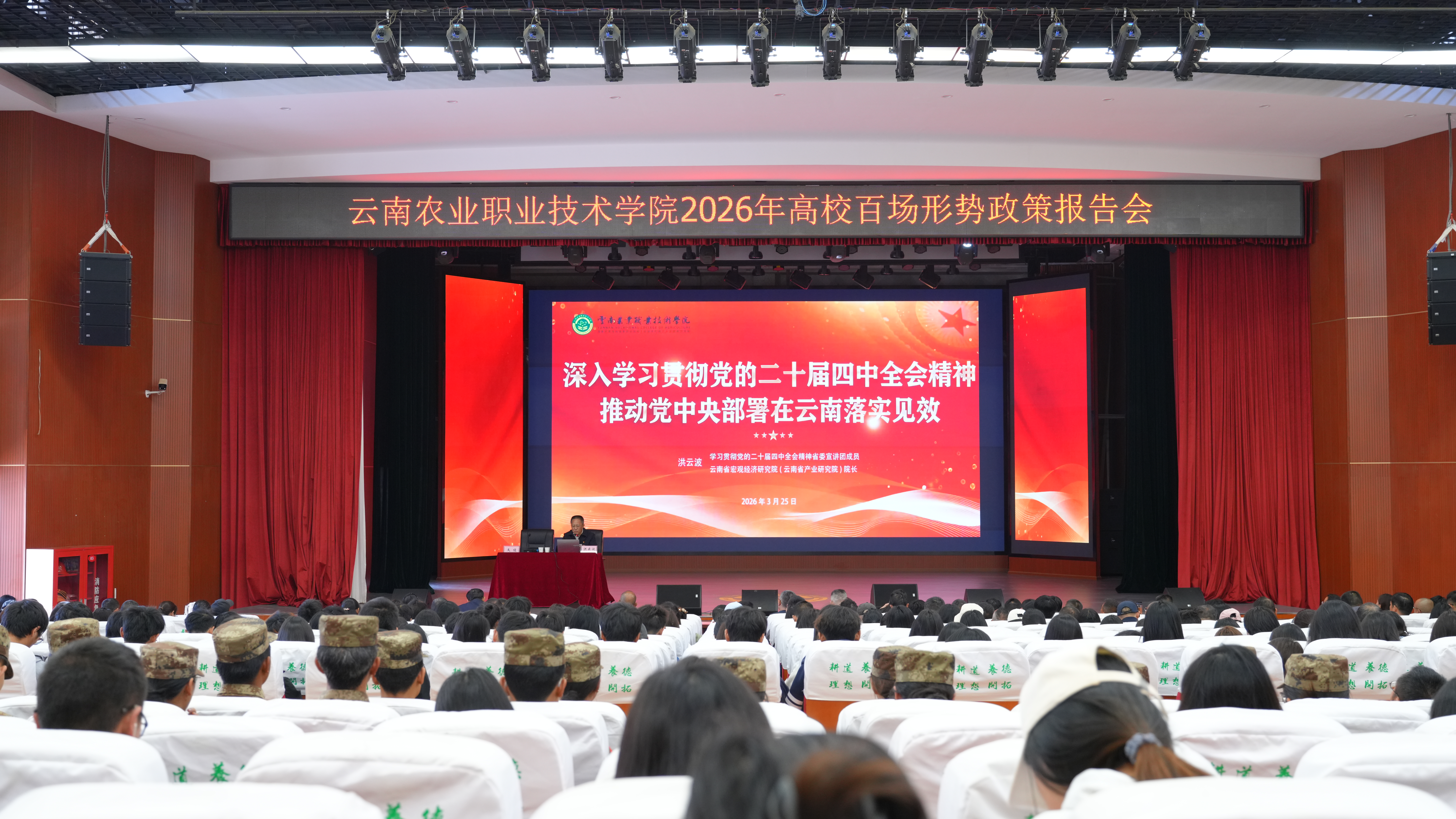 通知中心3月25日,我校举办高校百场形势政策报告会暨树立和践行正确政绩观学习教育读书班专题辅导,特邀云南省宏观经济研究院院长洪云波作《深入学习贯彻党的二十届四中全会精神 推动党中央部署在云南落实见效》专题报告,600余名师生齐聚蚕桑礼堂聆听报告。报告会由学校党委书记文俊主持。