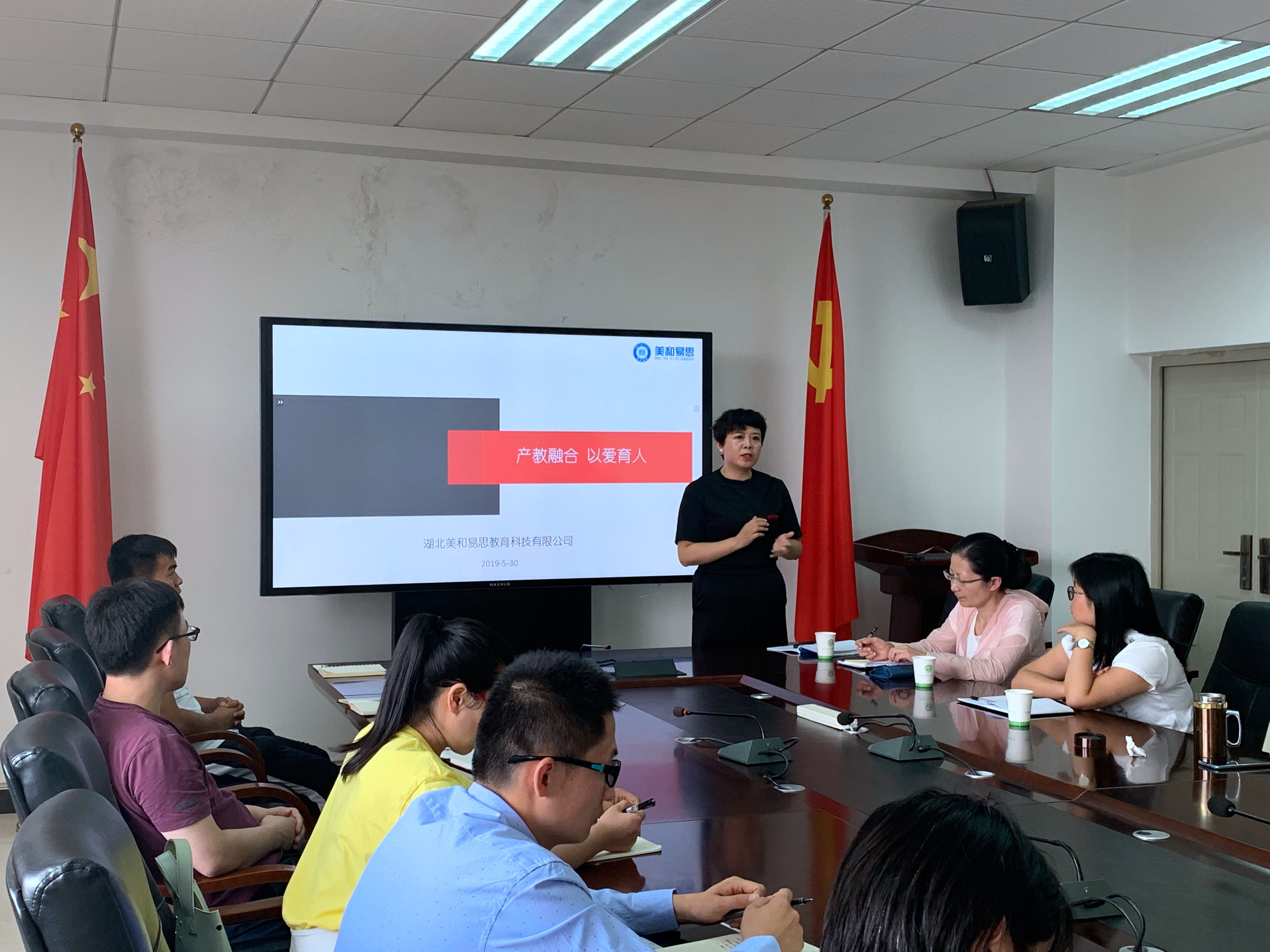 交流会由视频《班主任的一天》拉开序幕,视频展示了美和易思班主任关于考勤、课六、巡班、访谈、查寝等16个学生日常管理工作,让在场的领导和老师们都感受了美和易思的精细化管理。随后美和易思总监刘婧以“产教融合 以爱育人”为主题向与会领导、老师做学生管理工作分享,从湖北美和易思公司概况介绍、“产教融合 校企合作”人字培养模型及人字培养模型在云南农业职业技术学院的落地实践三个方面向在场的领导、老师做了汇报。并从三个维度介绍了美和易思如何践行爱的教育、如何在学生心中种因、育道的过程。