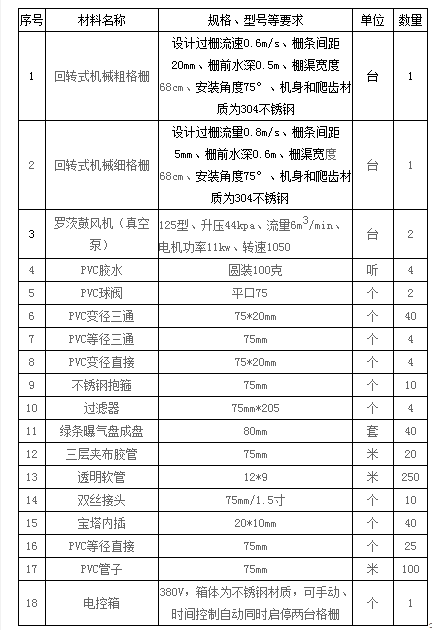 1.2 采购内容:通过公开询价方式确定1家入围单位,作为云南农业职业技术学院污水处理站格栅机风机设备采购项目供货商,供货商按采购清单提供设备,并完成设备的采购安装调试及售后服务。