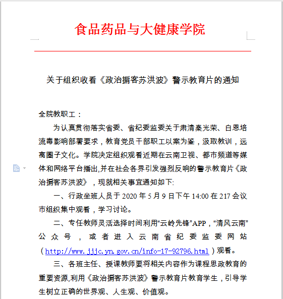 为认真贯彻落实省委、省纪委监委关于肃清秦光荣、白恩培流毒影响部署要求,教育党员干部职工以案为鉴,汲取教训,远离圈子文化,防止投机钻营。食品药品与大健康学院发出通知,要求全体教职工观看该警示教育片,并组织全体行政坐班人员于2020年5月9日下午14:00在217会议室利用云岭先锋党员远程教育设备进行了集中观看学习;同时要求专任教师灵活选择时间利用“云岭先锋”APP,“清风云南”公众号,或者进入云南省纪委监委网站进行观看学习;要求各班主任、授课教师将相关内容作为课程思政教育的重要资源,利用《政治掮客苏洪波》警示教育片教育学生,引导学生树立正确的世界观、人生观、价值观,根绝一切投机取巧,不劳而获的坏思想,发扬用真才实学、踏实奋斗来实现人生价值的作风,要知道正义可能会迟到,但绝不会缺席。