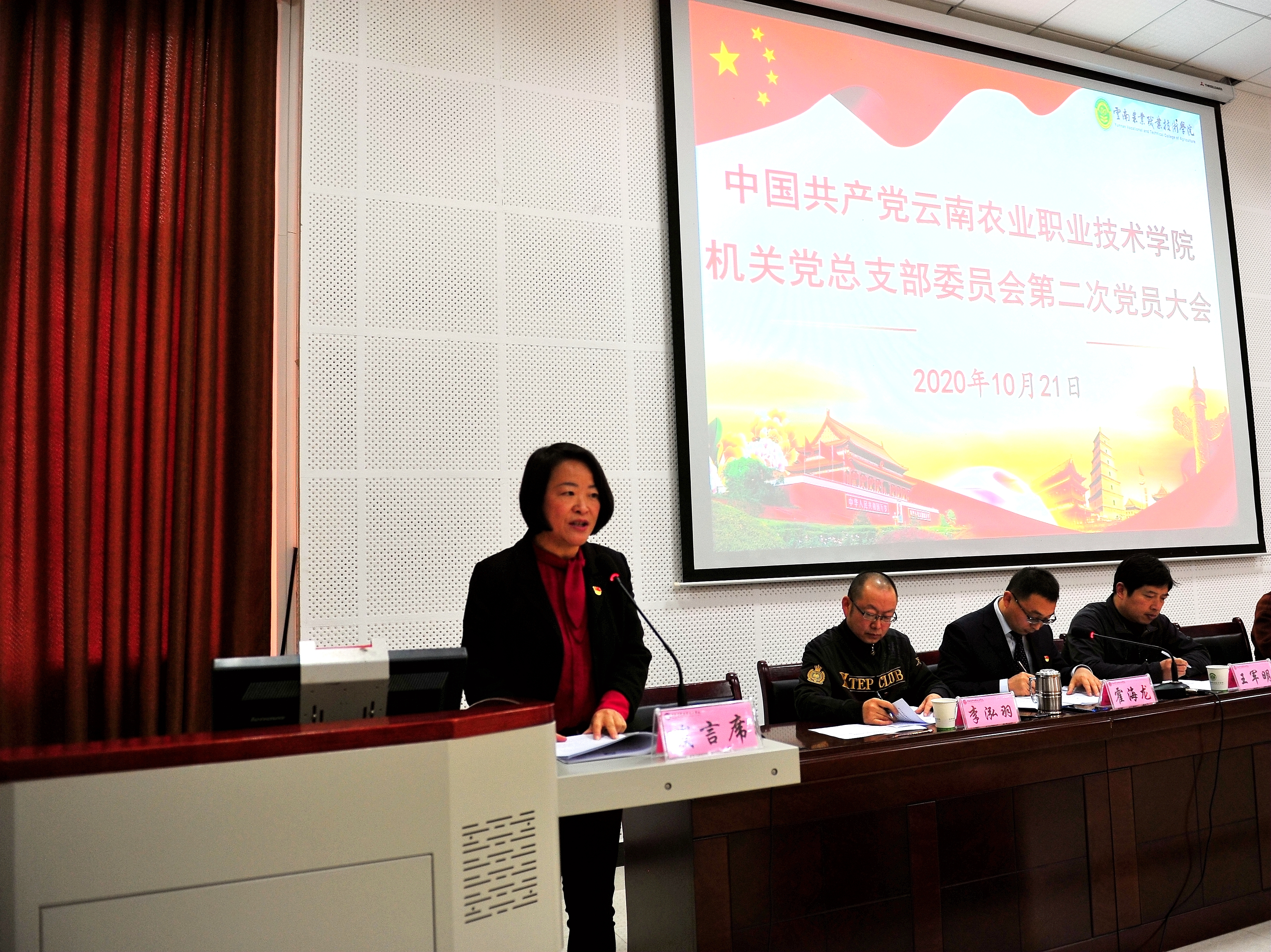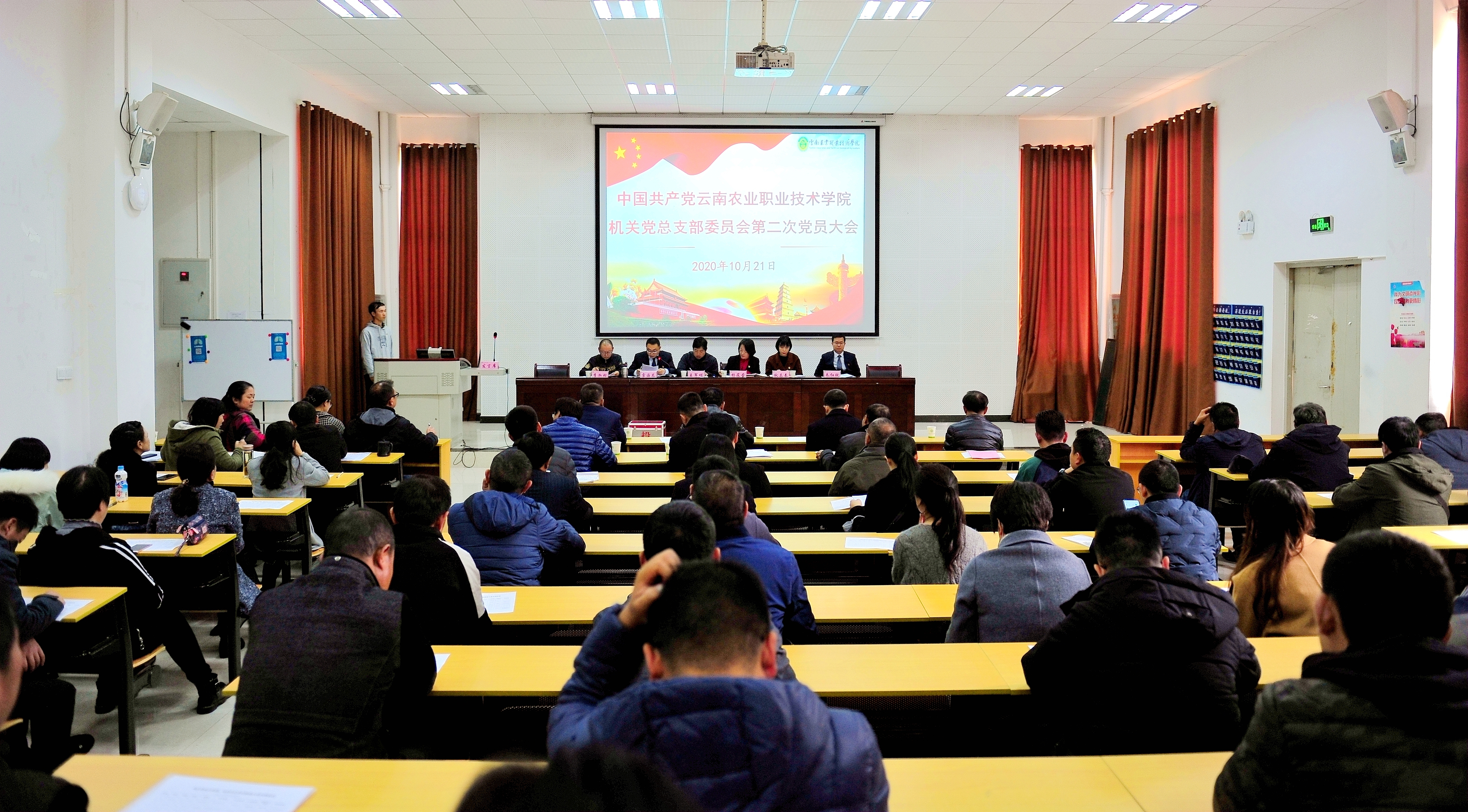 2020年10月21日,中共云南农业职业技术学院机关总支部委员会第二次党员大会在小哨校区综合楼阶梯教室顺利召开,大会主要听取和审议了第一届机关党总支部委员会工作报告和党费收缴使用管理情况报告,选举产生了机关党总支部第二届委员会委员。机关党总支部73名正式党员参加大会,学院党委书记崔金赋同志,党委副书记、院长文俊同志及其他党委委员均以机关党总支部普通党员身份参加大会。大会由上届机关党总支部委员会纪检委员霍海龙同志主持。